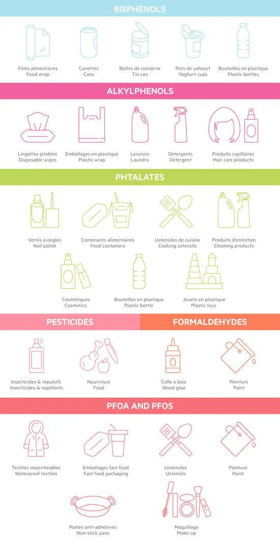 🔎 Endocrine-disrupting substances can be found in many everyday items: industrial ready meals, household cleaning products, kitchen utensils, various plastics, and sometimes even in certain cosmetics.